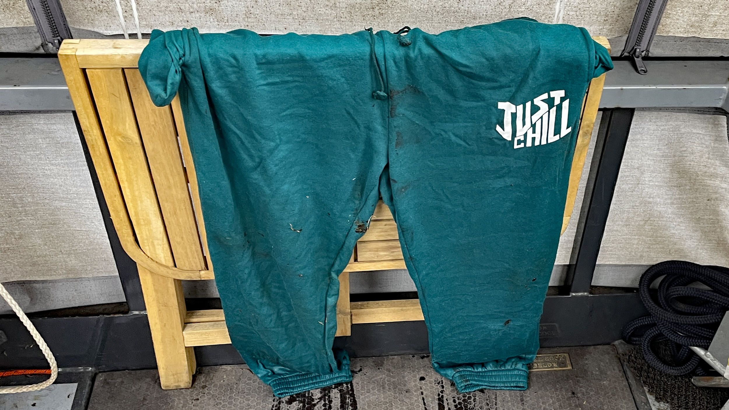 I unwound these newish-looking tracksuit bottoms from around the prop.